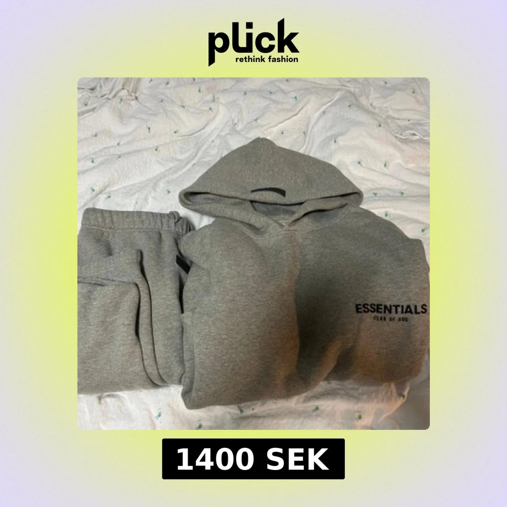 Säljer en grå tracksuit från Essentials Fear of God med svart logga på bröstet och ryggen och mitten av byxorna och nere på byxorna. Tröjan har huva, långa ärmar och är tillverkad i mjuk bomullsmix. Perfekt för dig som gillar streetwear och vill ha en clean look.