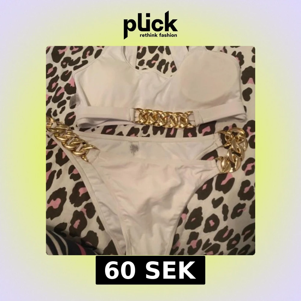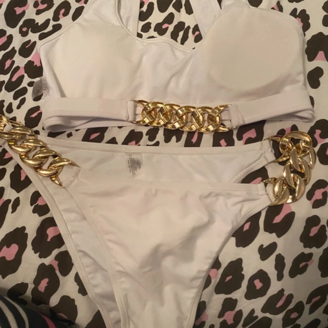 Superfräsch vit bikini med breda guldfärgade kedjedetaljer både på överdelen och sidorna av underdelen. Sportig topp med breda axelband och högt skurna trosor. Materialet är nylon, polyester och spandex för en skön och stretchig känsla.
