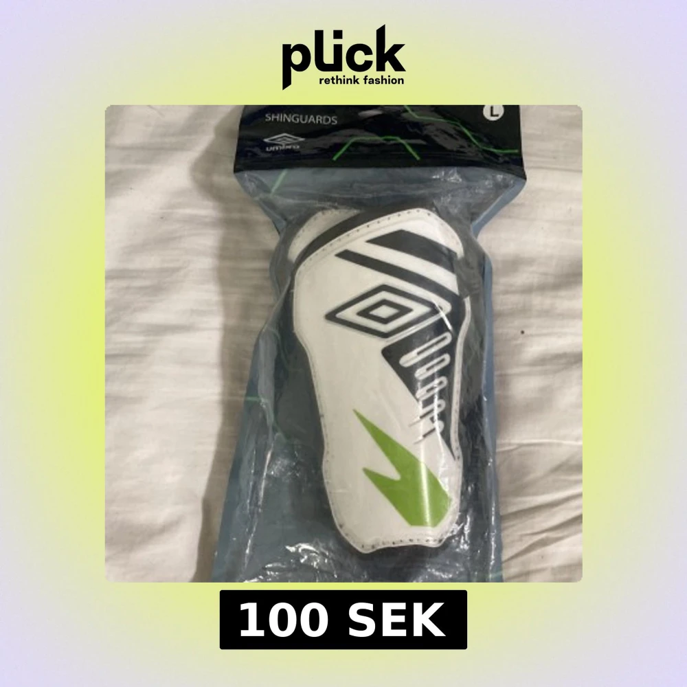Säljer ett par Umbro benskydd i storlek L. De är vita med svarta och limegröna detaljer och har en sportig design med Umbro-loggan på framsidan. Perfekta för dig som spelar fotboll och vill ha bra skydd på planen.