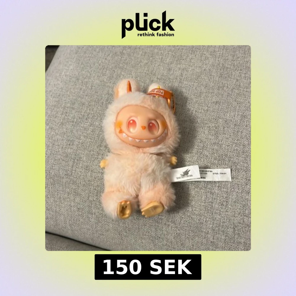 Bilderna visar en mjukisdocka från POP MART, serien THE MONSTERS. Dockan har ett lurvigt, ljusrosa yttre och ett glatt, fantasifullt ansikte med stora ögon och ett brett leende. Perfekt som samlarobjekt eller rolig dekoration för unga och unga vuxna som gillar unika figurer.