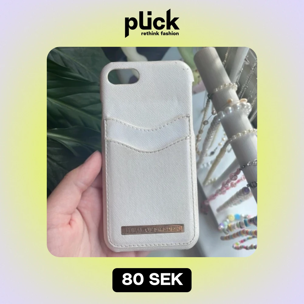 Mobilskal till iPhone 7 från ideal of sweden. Vitt läder med två kortfack. Lite smutsigt som du ser på bilden men det syns inte om man har kort i fickan. Lite skadat i hörnet, se sista bild.