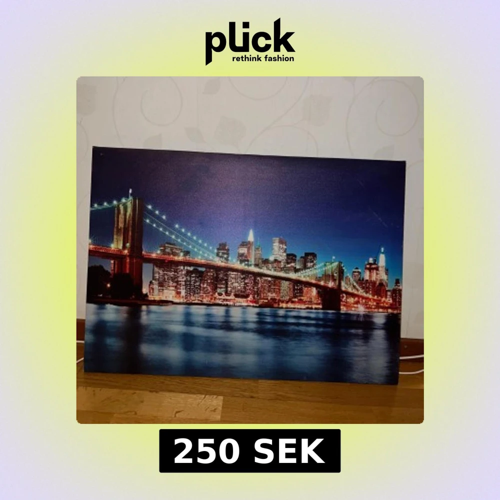 En tavla med ett nattmotiv av en stad och en bro, troligen New Yorks skyline och Brooklyn Bridge. Perfekt för att ge ditt rum en urban och modern känsla. Passar dig som gillar storstadsvibbar och snygg inredning.