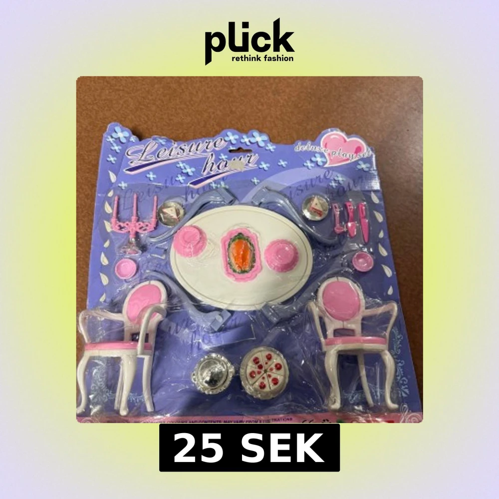Charmigt lekset med matbord, två stolar, tallrikar, bestick, tårta och andra tillbehör. Perfekt för barn som gillar att leka med dockhus eller skapa egna middagsbjudningar. Allt är nytt i förpackning och i fint skick.
