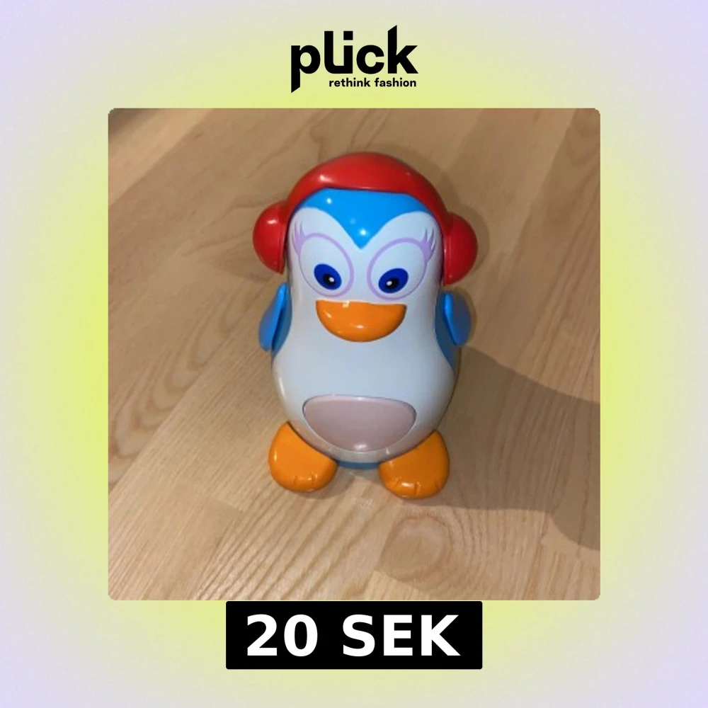 Blå och vit leksaks pingvin. Ska egentligen kunna rita av sig själv om man stoppar i en speciell penna men den funktionen fungerar ej längre därav lågt pris samt ”dåligt skick”. Kanske ändå kan uppskattas av någon och få ett nytt hem.