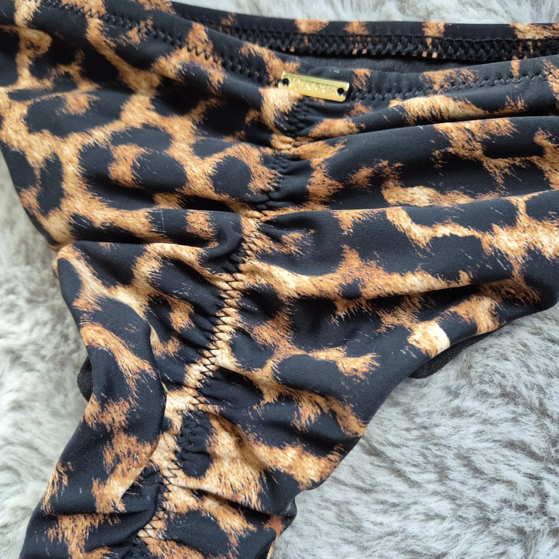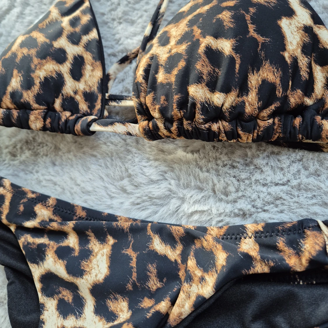 Leopardmönstrad bikini i trekantsmodell med knyt i nacken och ryggen samt matchande bikinitrosa med rynkad baksida. Storlek S. Oanvänd men lapparna är avklippta.