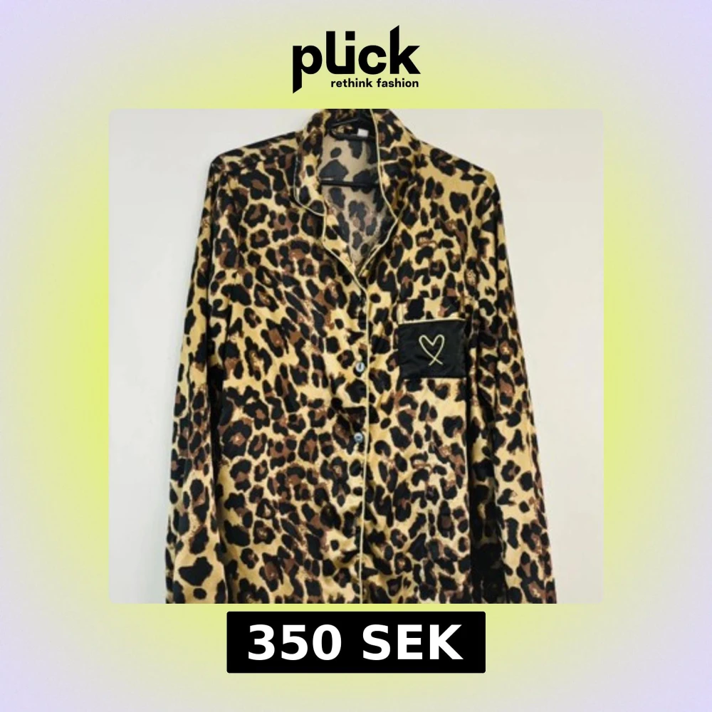 Säljer en leopardmönstrad långärmad skjorta i glansigt satinmaterial. Skjortan har svarta detaljer, knappar framtill och en svart bröstficka med ett broderat hjärta i gult. Perfekt för dig som vill sticka ut med ett djurmönster.