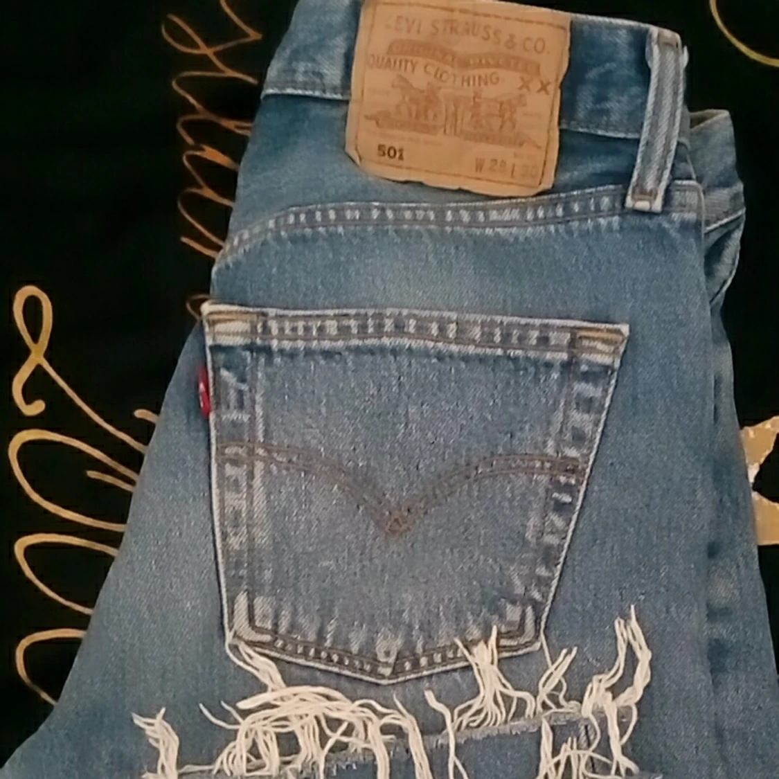 Blåa Levis 501 vintage med slitning nedtill på jeansen.
