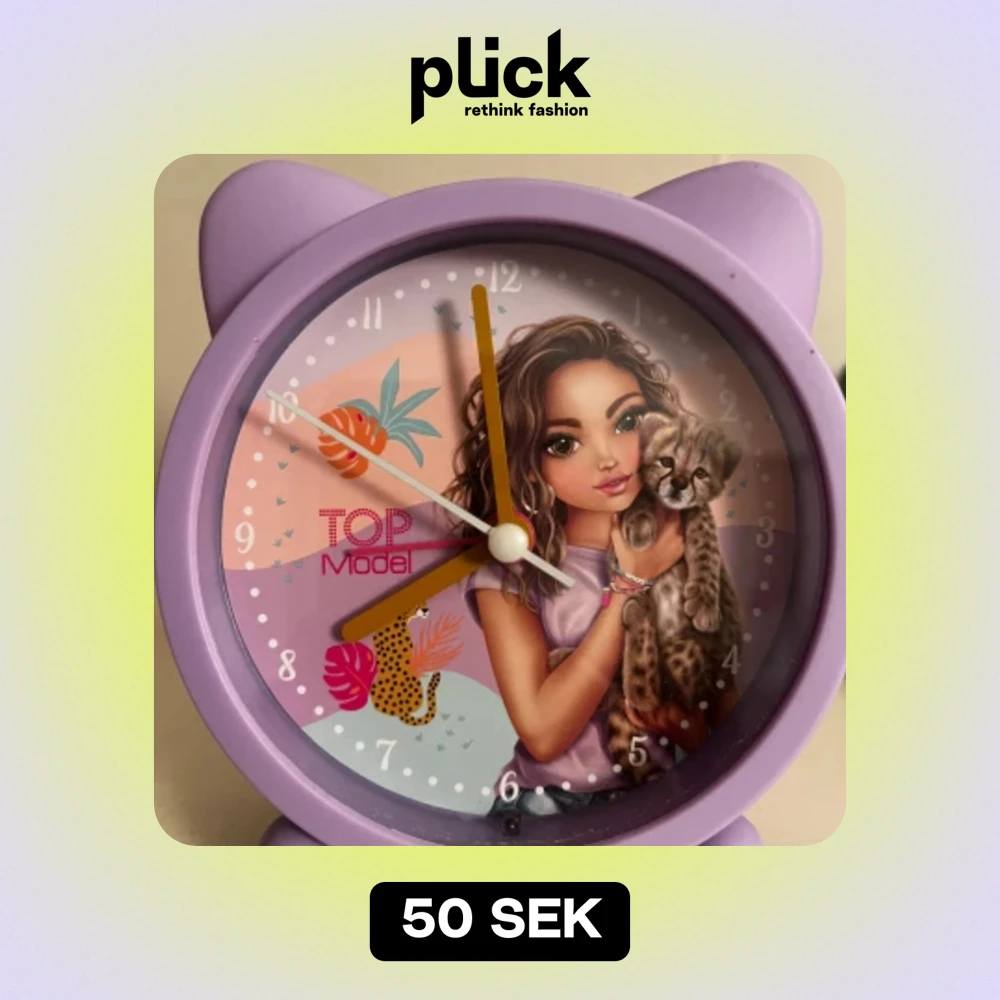 Säljer en superfin lila väckarklocka från Top Model. Den har en söt design med kattöron och en bild av en tjej med en kattunge på urtavlan. Klockan har tydliga siffror och färgglada visare. Perfekt för att liva upp rummet och hålla koll på tiden!