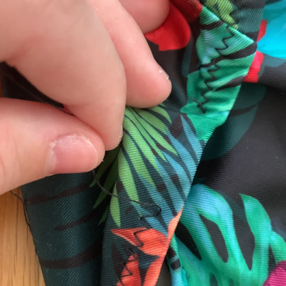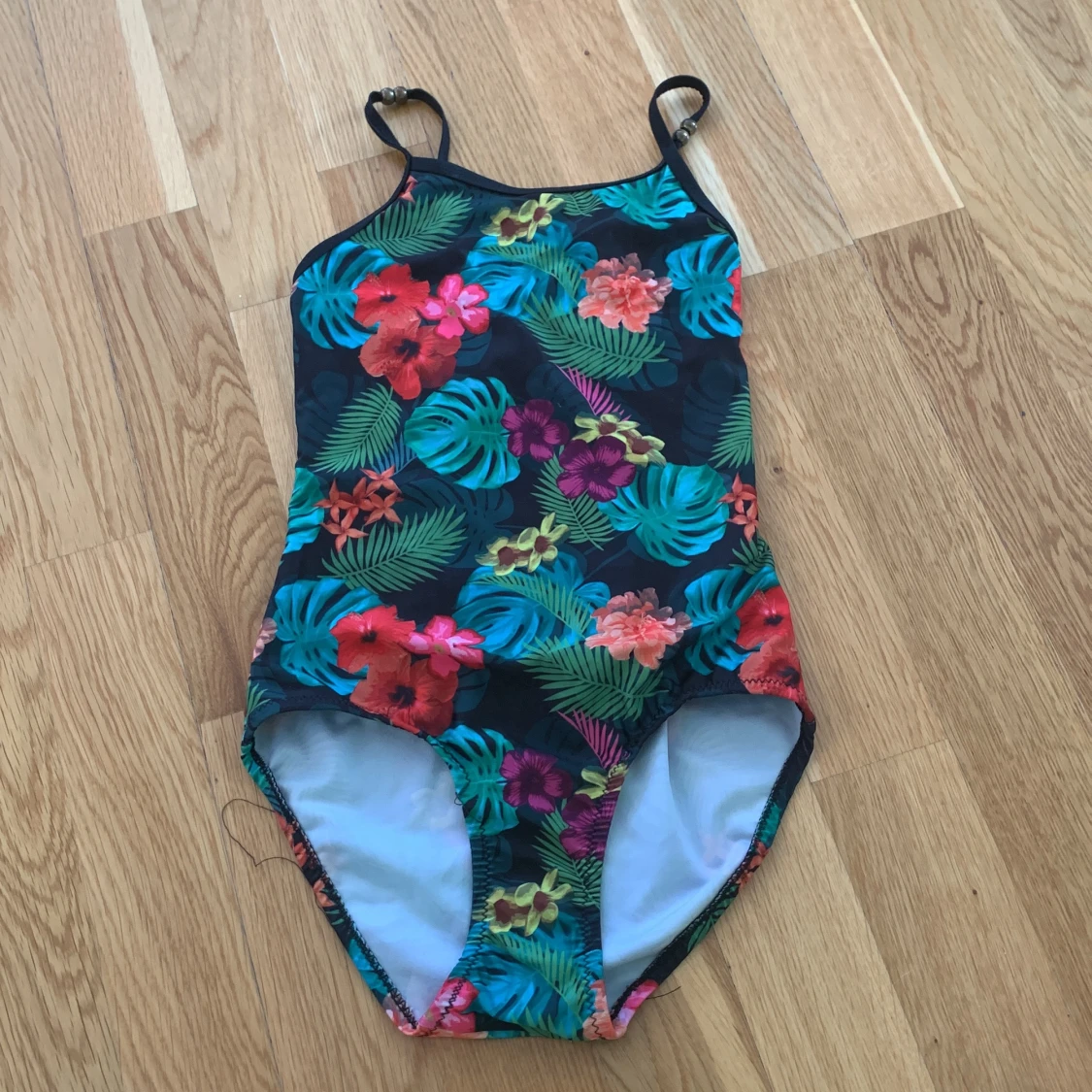 Detta är en bikini i storleken 134-140 som sägs vara för 8-10 år gamla. Den är använd många gånger och har några trådar som dragits loss så därför säljs den väldigt billigt. Den säljs för 10kr + frakt