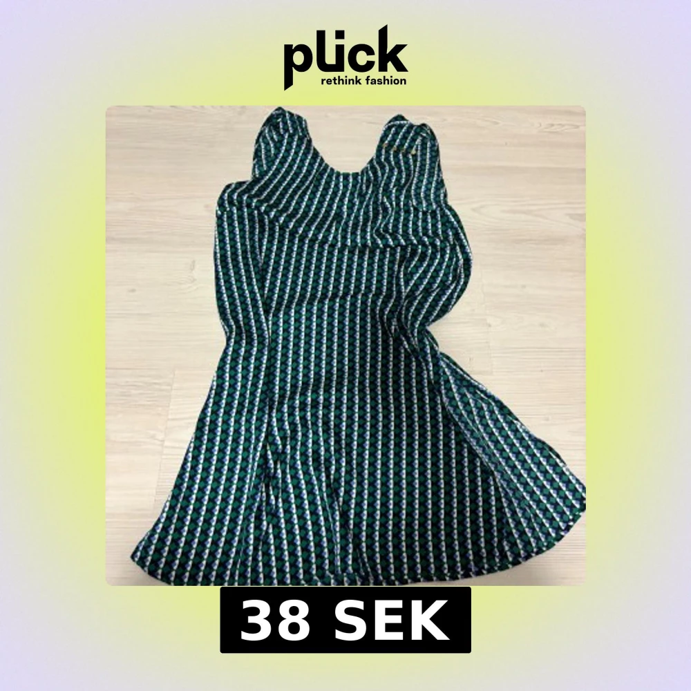 Mönster i grönt, blått, vitt och svart. Den har har rund halsringning och dekorativa guldknappar på axeln. Tillverkad i mjukt, lätt material som ger ett skönt fall.
