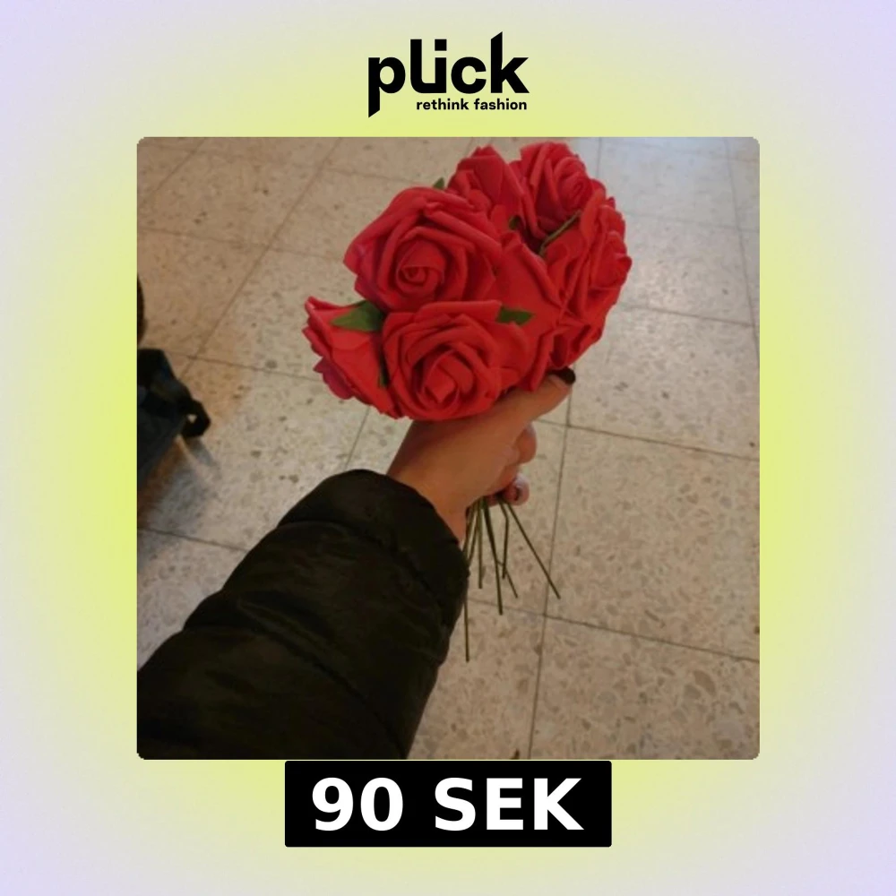 Säljer en unik sminkborste formad som en röd ros med gröna blad. Borsten har ett långt, smalt handtag i metall och själva borstdelen är formad som blomblad. Perfekt för att applicera puder eller rouge och en snygg detalj i sminksamlingen.
