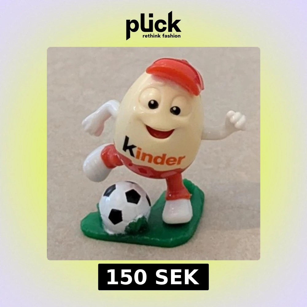 Unik samlarfigur från Kinder med röd keps. Figuren är gjord av plast och står på en grön platta av plast med en klassisk svartvit fotboll.