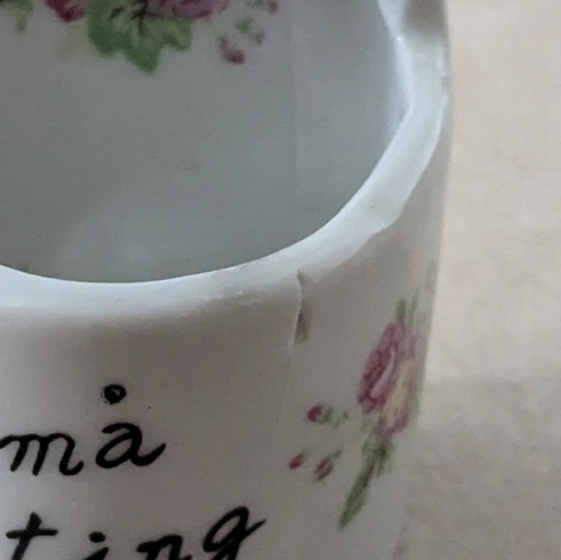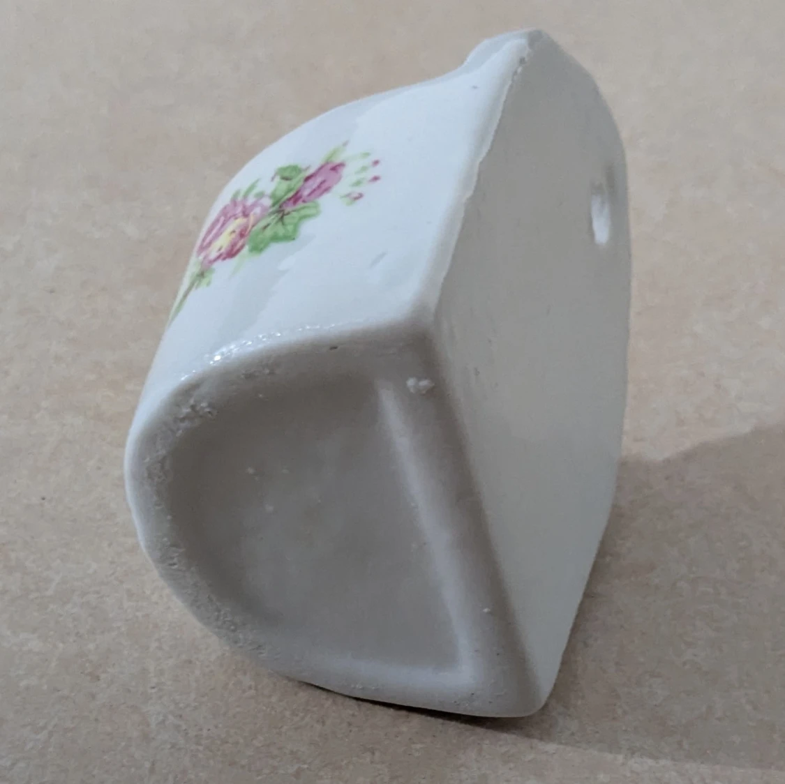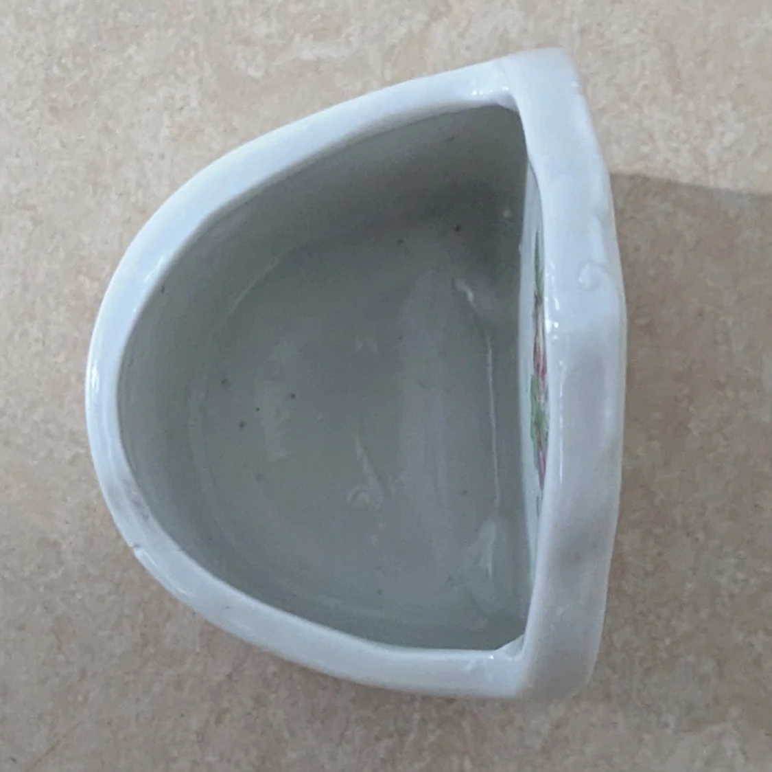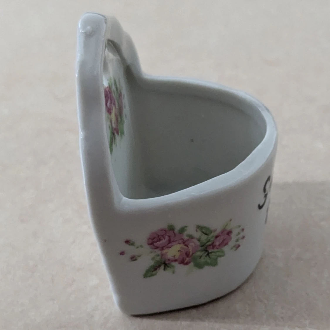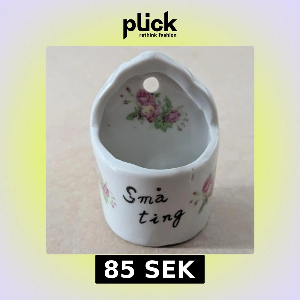Liten porslinsbehållare med texten 'Små ting' och blommönster. Kan hängas på vägen eller ha stående på hylla eller bord eller liknade och används till att förvara små ting. En mindre defekt finns ett litet hack, defekten visas på bild