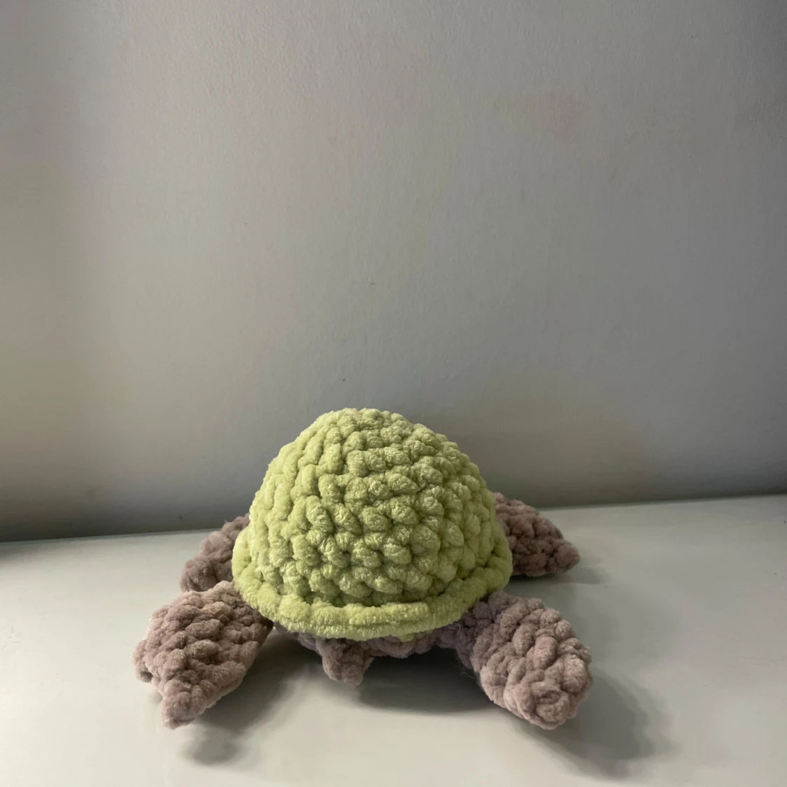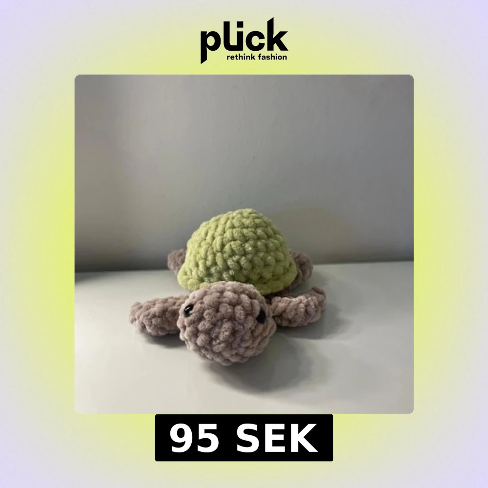 En hand virkad sköldpadda gjord av mjukt garn och mjuk stoppning. Den är ca 16 cm lång.