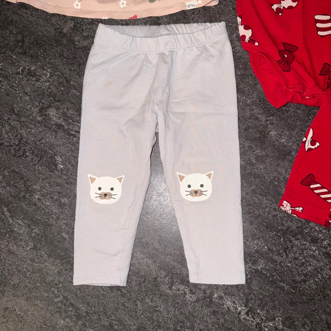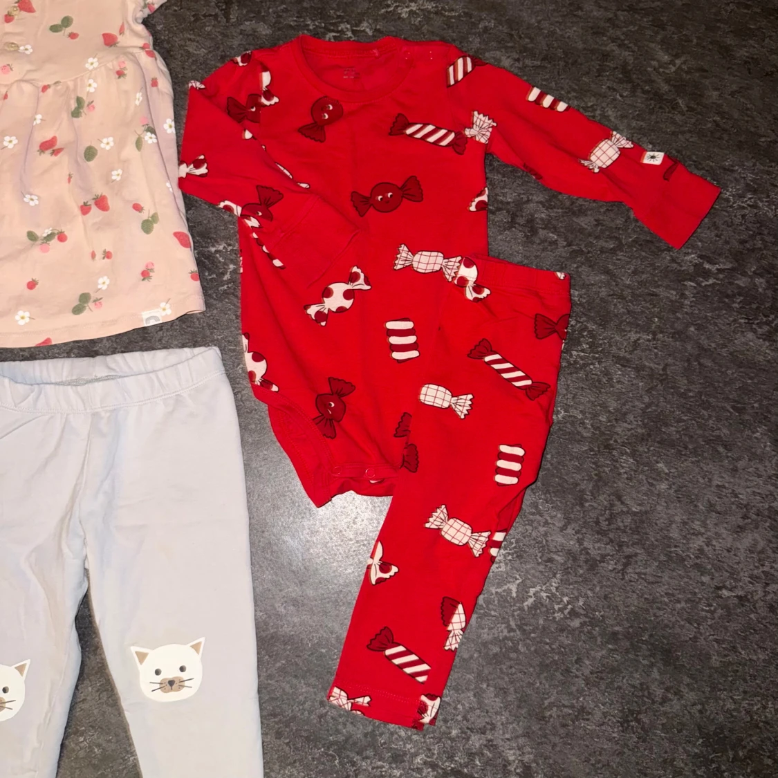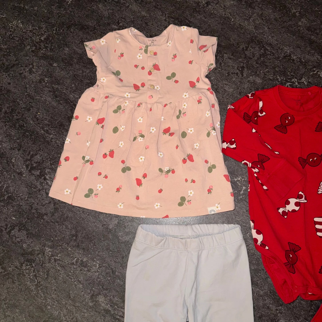 Alla plaggen är från Lindex i storlek 80, super fint skick på alla! Innehåller en klänning, ett par leggings och ett lite juligare set!