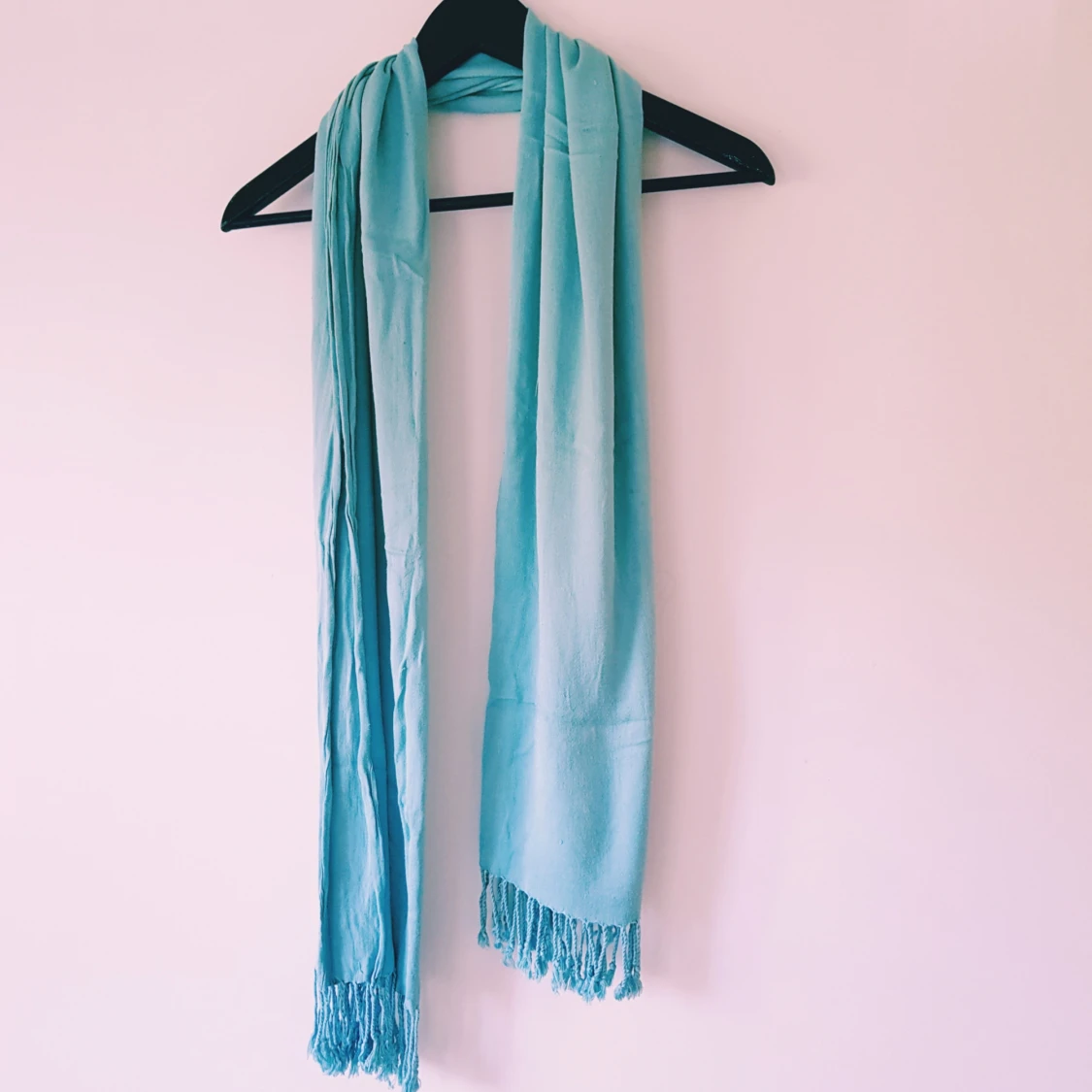 En stilren ljusblå halsduk från Lindex med fransar i ändarna. Halsduken är tunn och mjuk, perfekt att slänga över axlarna. Enkel design utan mönster, vilket gör den lätt att matcha med olika outfits. Helt skick dock noppror