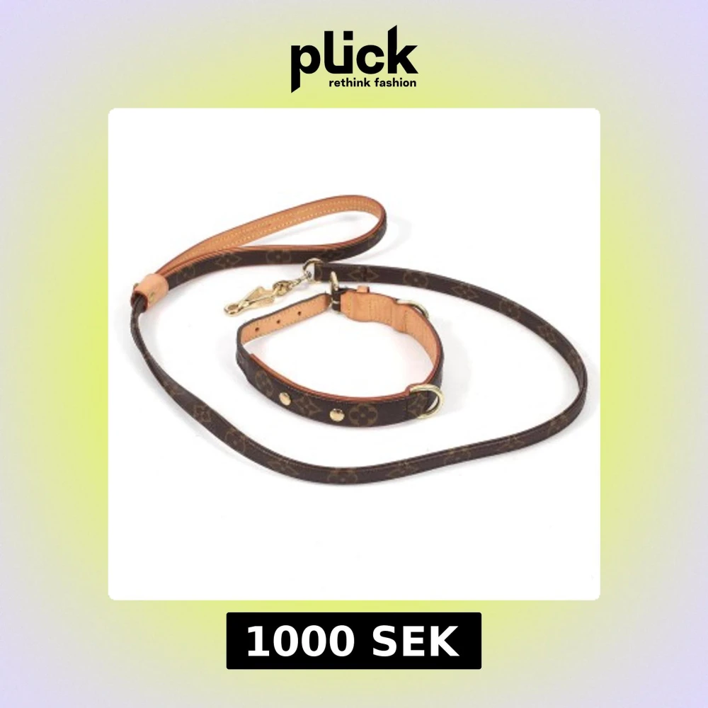 Säljer ett exklusivt hundhalsband med matchande koppel från Louis Vuitton. Setet är i brunt skinn med klassiskt monogrammönster och detaljer i guldmetall. Perfekt accessoar för din hund.