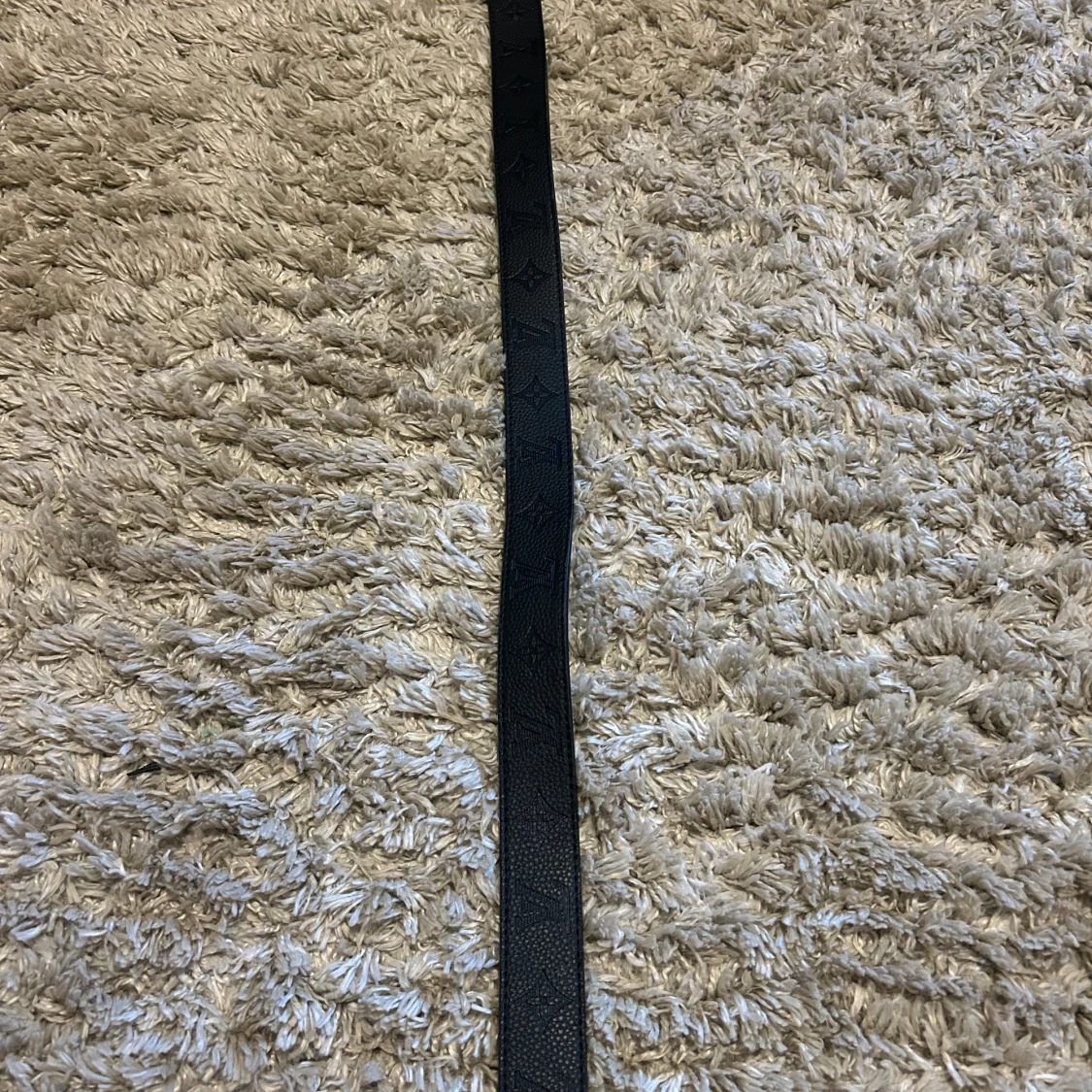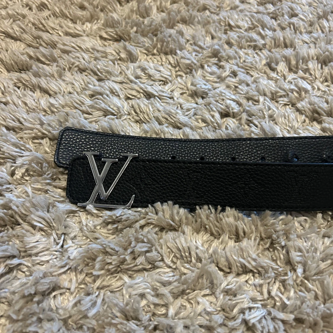 Snyggt svart skärp från Louis Vuitton i äkta skinn med klassisk LV-logga i silvermetall framtill. Bältet har präglat monogrammönster längs hela remmen och en stilren, rektangulär form. Perfekt accessoar för att lyfta din outfit. 105 cm i längden