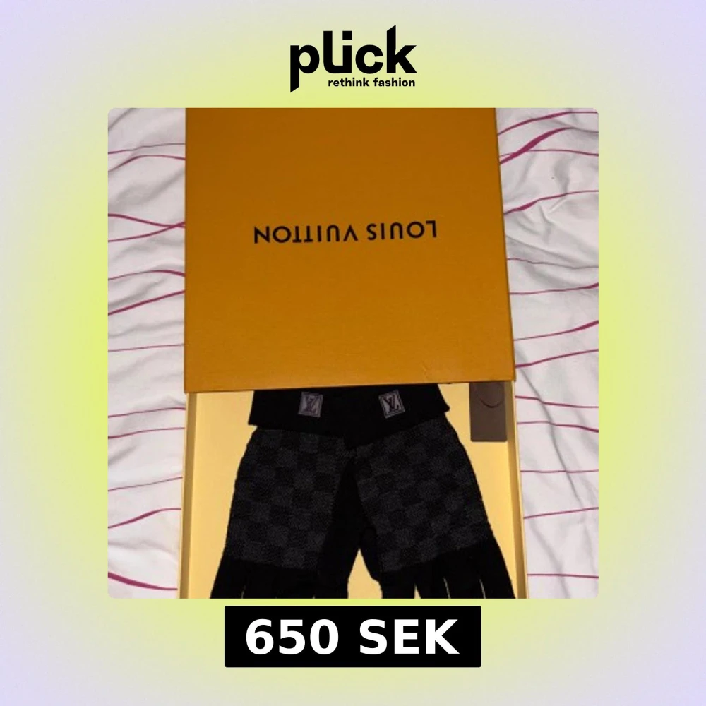 Exklusiva svarta stickade handskar från Louis Vuitton med klassiskt rutig mönster och LV-logga på mudden. Snygg design med diskreta mörkgrå rutor och ribbade muddar. Perfekta för dig som vill ha både stil och värme under kalla dagar.