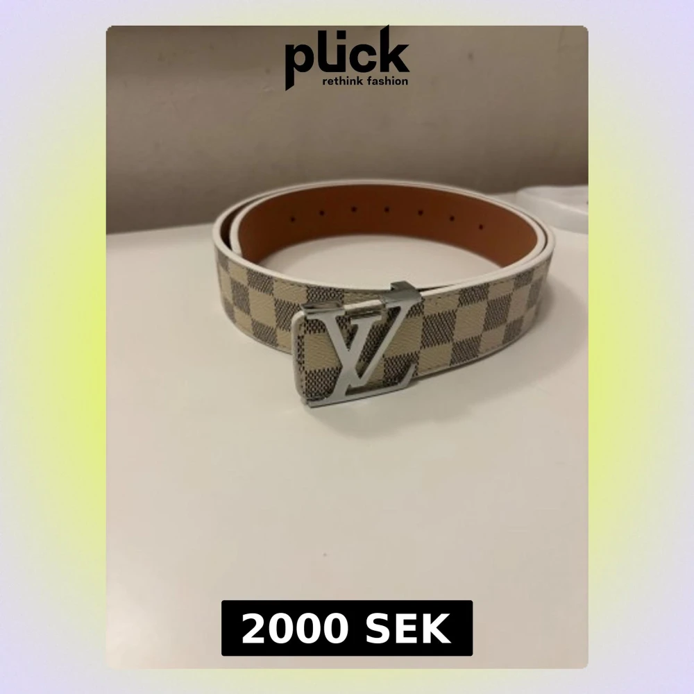 Säljer ett Louis Vuitton bälte med klassiskt rutigt mönster i beige och grått. Bältet har en bred form och en snygg LV-spänne i silver. Tillverkat i skinn med vit kant och insida i ljusbrunt. Perfekt för dig som vill ha en lyxig detalj till outfiten.