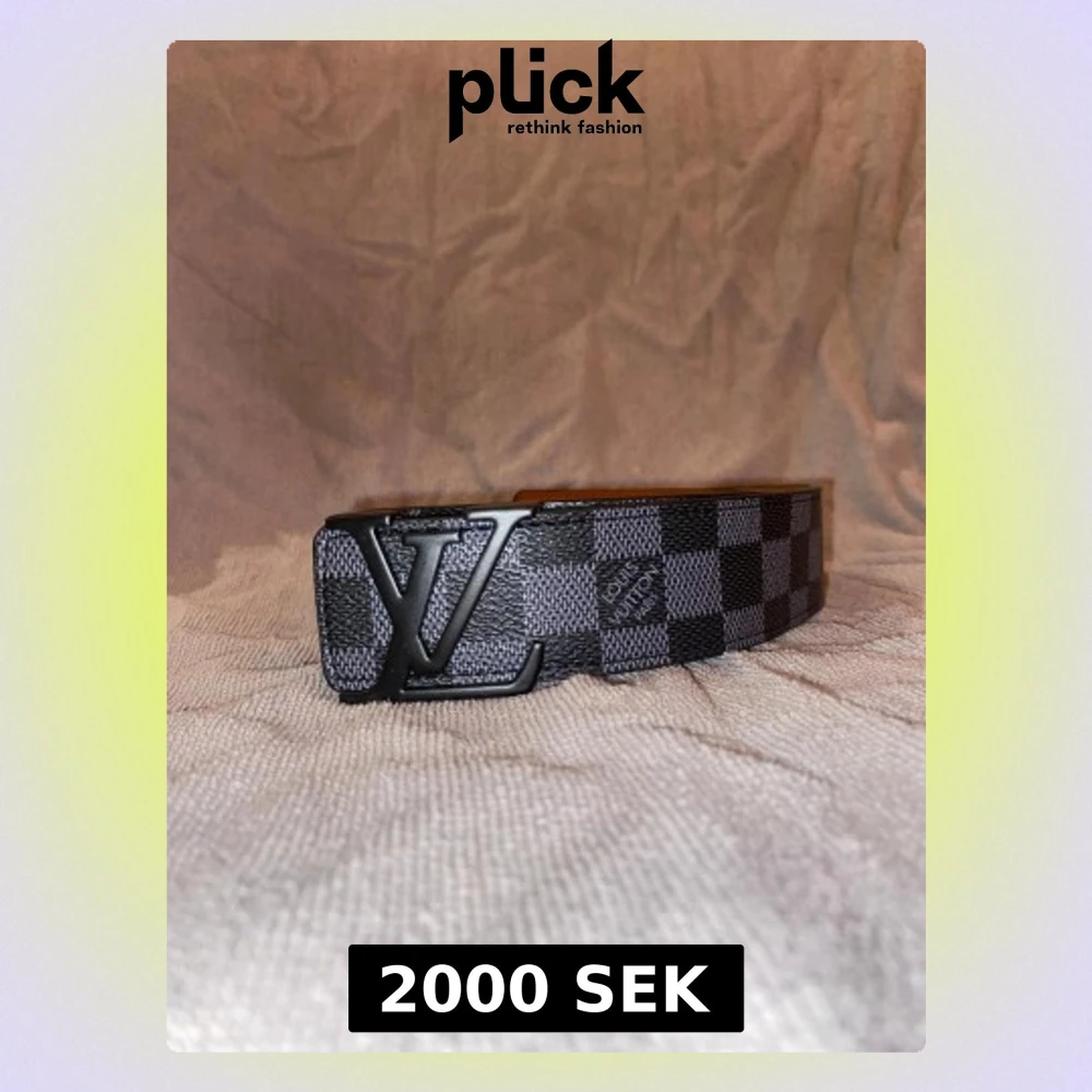 Säljer ett Louis Vuitton bälte med ikoniskt rutigt mönster i svart och grått. Bältet har en stor LV-logga i svart metall som spänne och är tillverkat i exklusivt skinn med beige insida. Perfekt accessoar för dig som gillar designer och vill sticka ut.