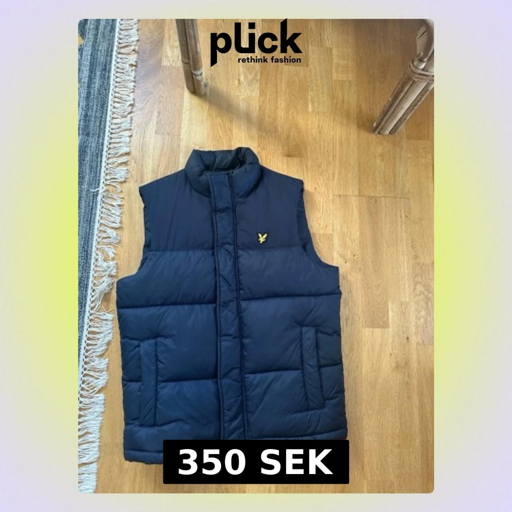 Snygg mörkblå dunväst från Lyle & Scott med gul logga på bröstet. Västen har hög krage, två fickor framtill och quiltad design. Perfekt att slänga över en hoodie eller tröja för extra värme.