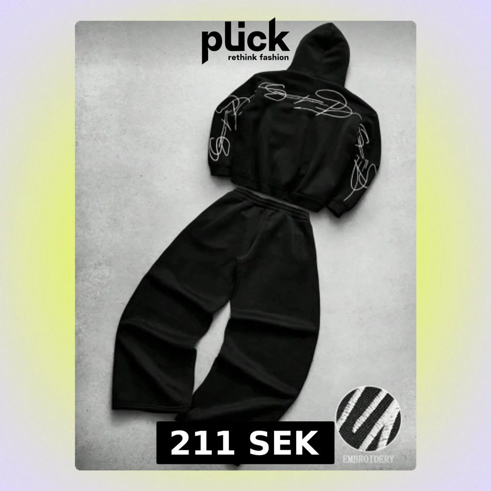 Säljer en svart hoodie med huva och broderade vita linjer på ärmar och rygg. Hoodien har en avslappnad passform och är gjord i mjukt material som känns skönt mot huden. Perfekt för dig som gillar streetwear och vill sticka ut med coola detaljer.
