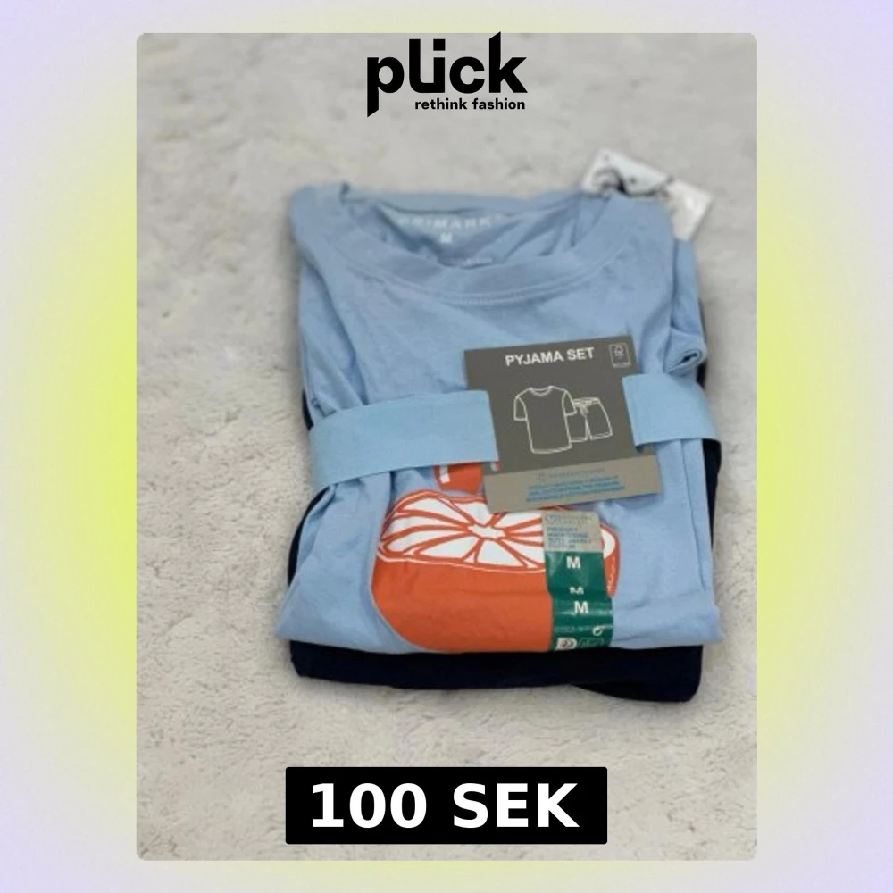 Bilderna visar ett pyjamasset med ljusblå t-shirt och mörkblå shorts från Primark, men ingen väst finns med.