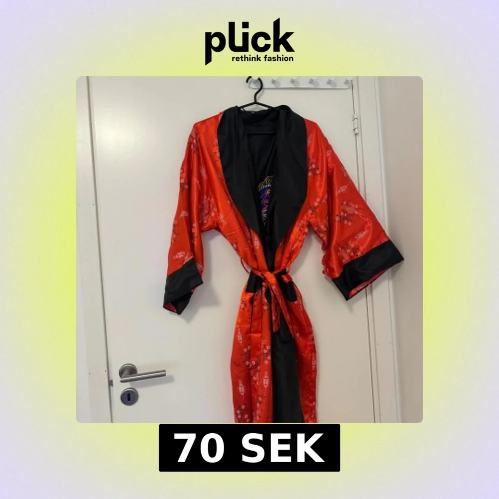 Säljer en röd kimono med svarta slag och ärmslut. Kimonon har ett vackert asiatiskt mönster med fåglar och blommor samt ett knytband i midjan. Materialet är glansigt och känns lyxigt.