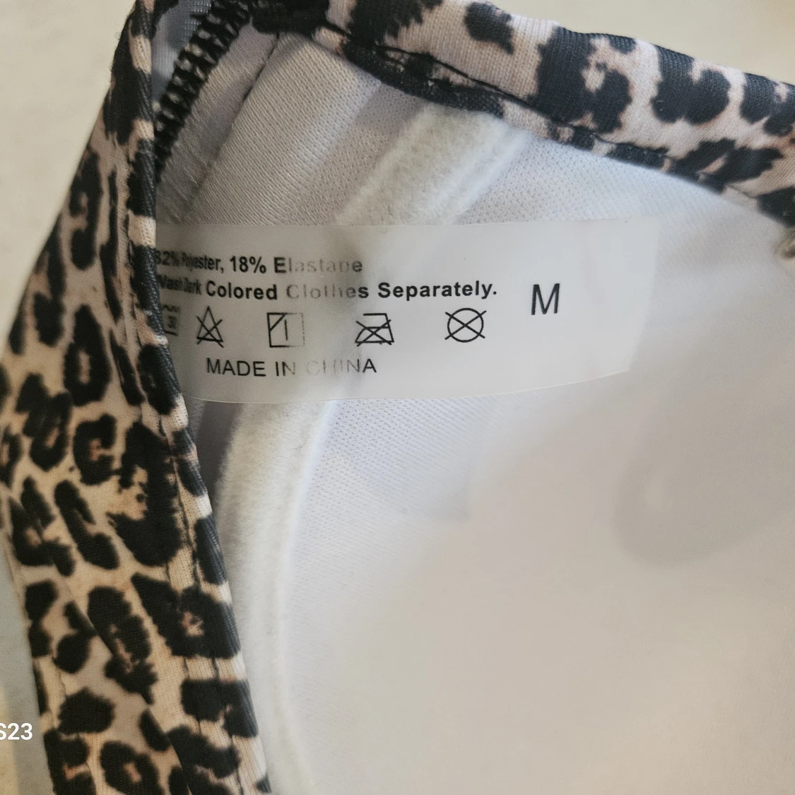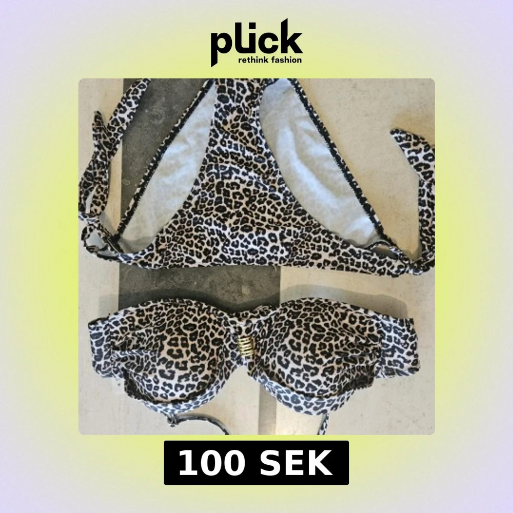Snygg bikini i leopardmönster med svarta, bruna och beige toner. Överdelen har vadderade kupor, gulddetalj framtill och knyt i ryggen. Underdelen har klassisk trosa med knyt i sidorna. Materialet är stretchigt i polyester och elastan – perfekt för stranden!