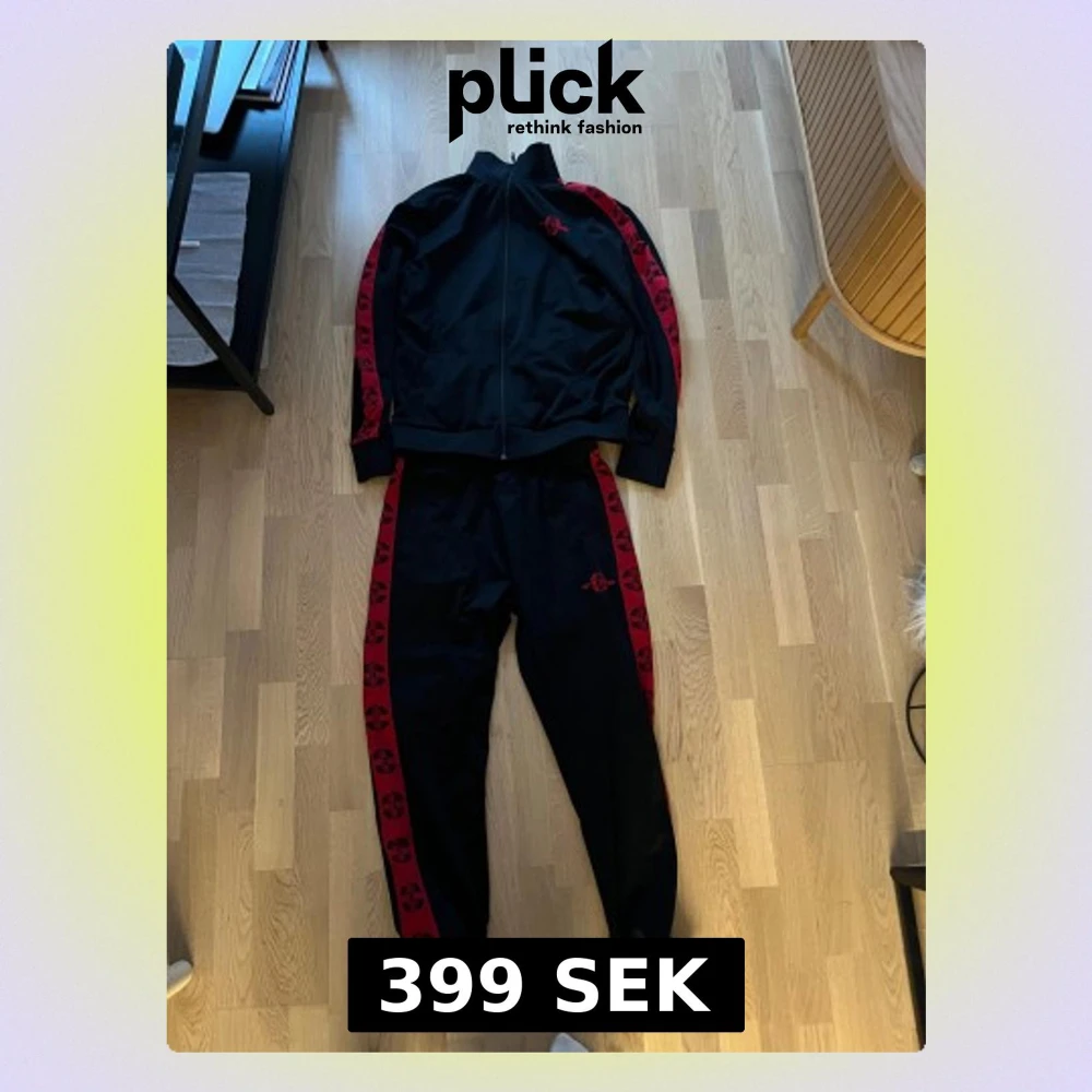 Svart set från Better Bodies i storlek M med röda logoband längs ärmarna och dragkedja framtill. Materialet är mjukt och syntetiskt, perfekt för träning. Långärmad modell med ribbade muddar och sportig look. Röd broderad logga på bröstet för extra stil. OBS byxorna saknar snöre, se bild 3.