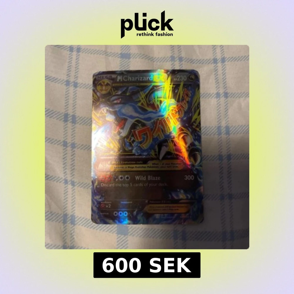 Säljer ett M Charizard EX Pokémonkort med holografisk yta. Kortet har en kraftfull design med Charizard i fokus och texten 'Wild Blaze' som attack. Perfekt för samlare eller spelare som vill förstärka sin kortlek.