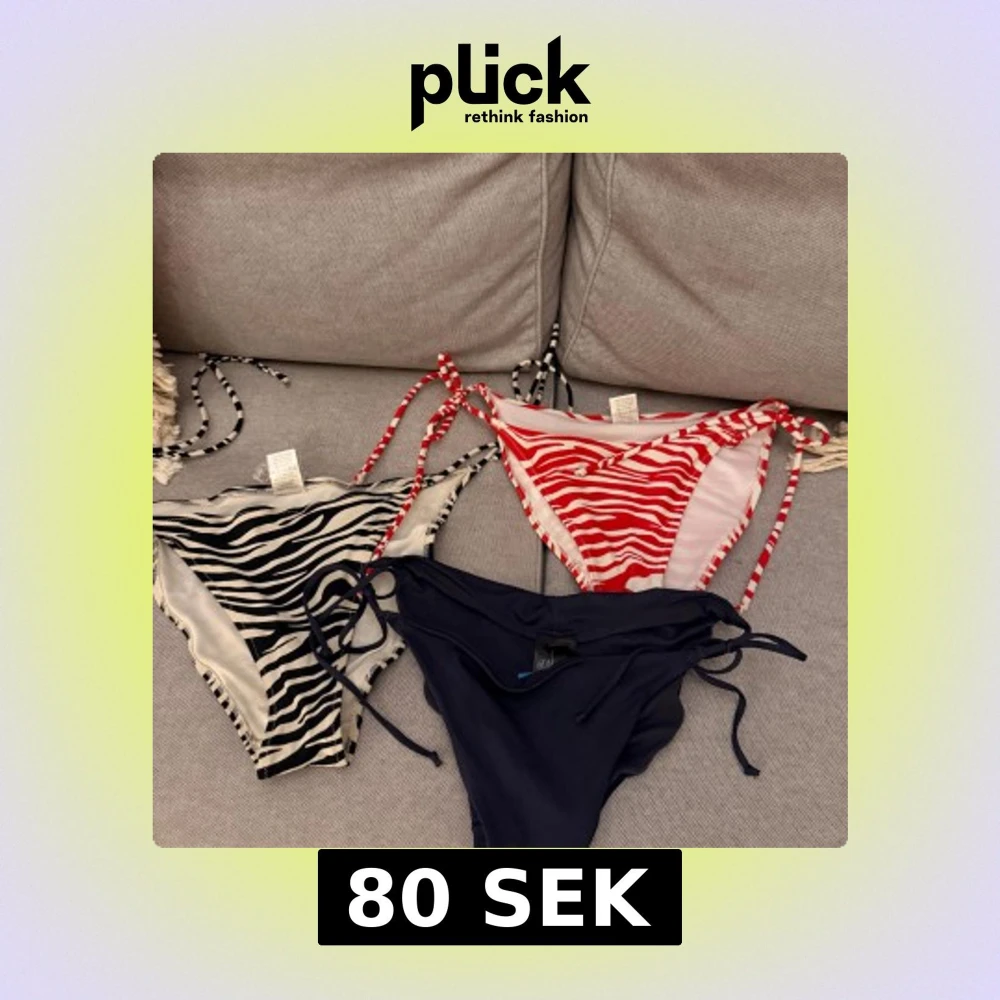 Tre snygga bikiniunderdelar: en svartvit zebramönstrad och en rödvit zebramönstrad från Gina Tricot (båda i M) helt okej skick, samt en marinblå från H&M (strl 40) oanvänd. Alla har knyt i sidorna och är perfekta för stranden i sommar. 80kr för alla, går att köpa separat för 30kr/st.