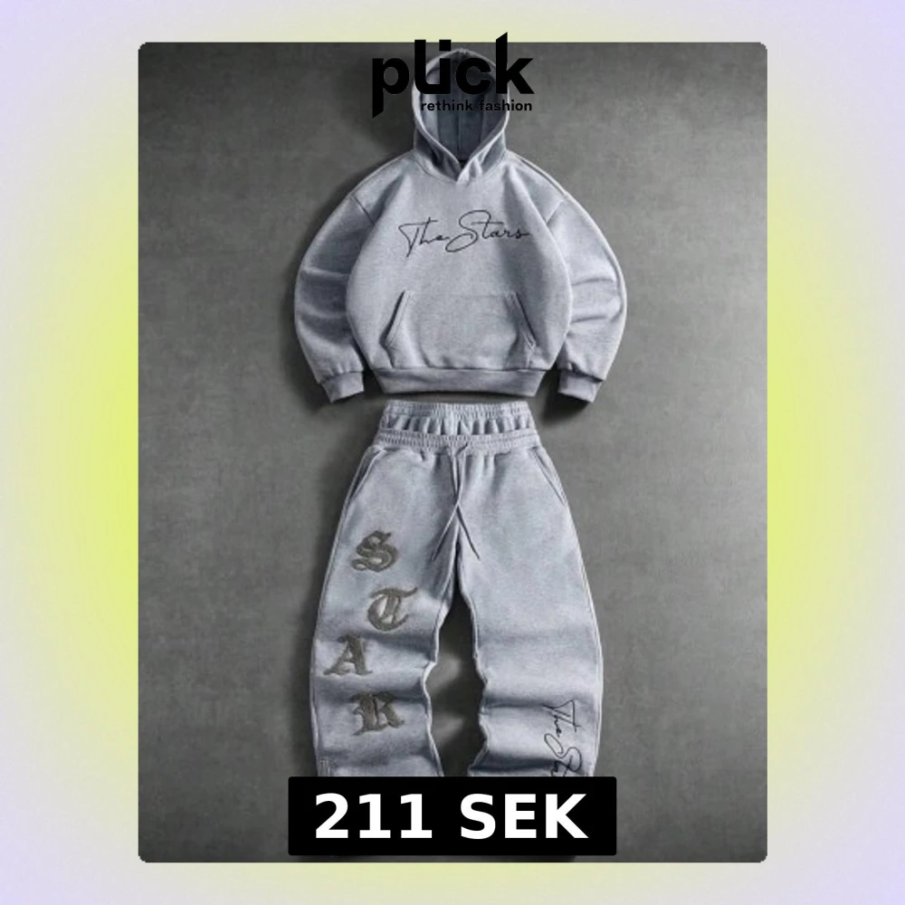 Medium grått mjukisset med hoodie och byxor. Kan därför inte ge någon västbeskrivning.