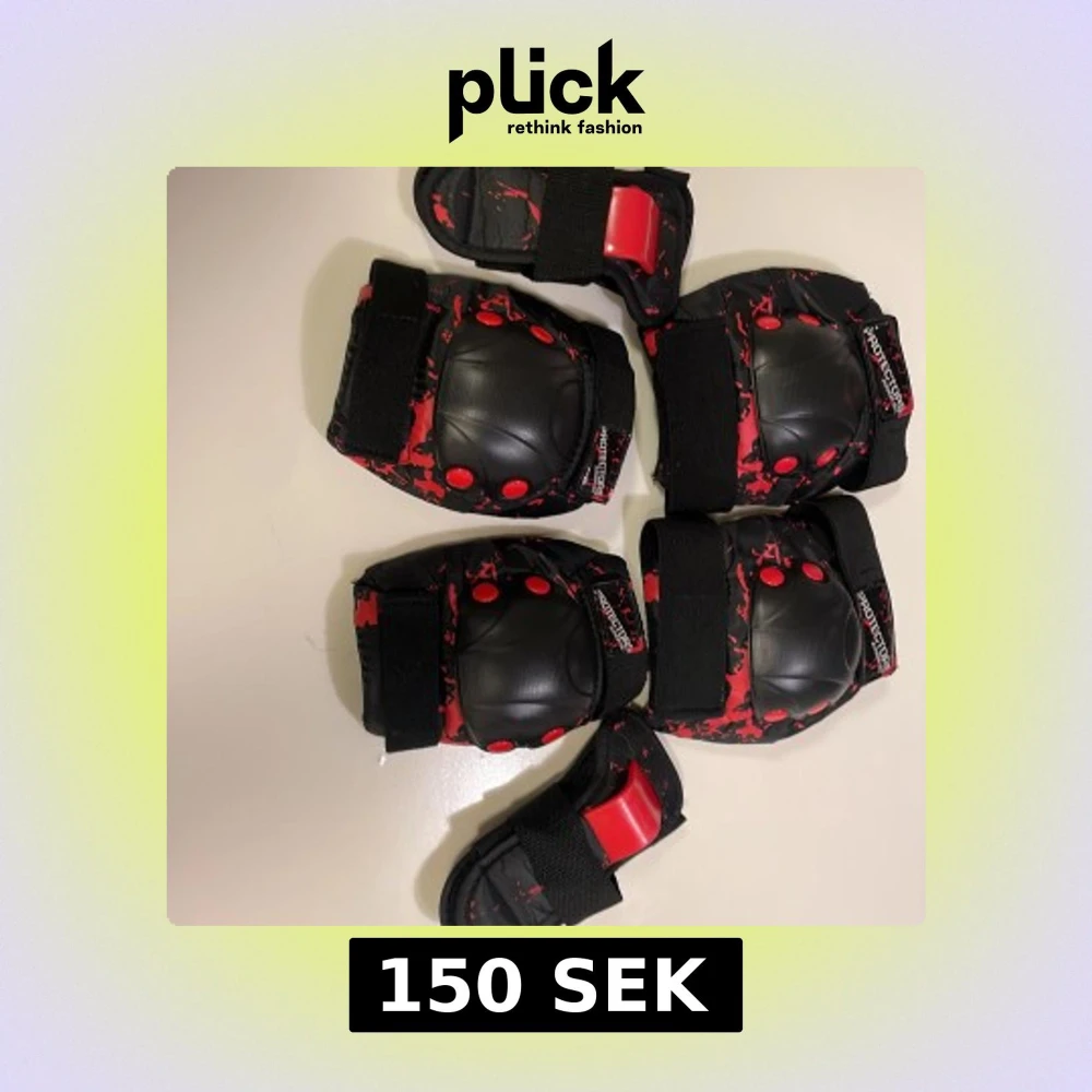 Säljer ett set med svarta och röda skyddshandskar från Protector i storlek M. De har coolt röd-svart mönster och hårda skyddsplattor på ovansidan, perfekta för rullsport eller skateboard. Justerbara kardborreband för bästa passform.