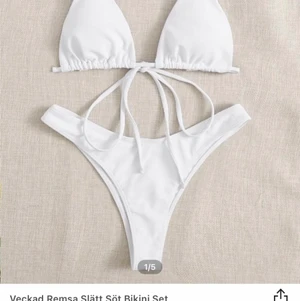 Vit fin volang bikini, köptes från shein för 1 dag sedan men de var tyvär för liten i toppen. Bikinin ser exakt ut som på bilden och samma färg. Beställde i stoleken m men skulle säga att jag fick den i xs/s i toppen och s i underdelen. Skulle nog passa någon med a eller b kupa💕 skriv gärna om du har några frågor💕 bilderna är från shein då bekinin var för liten för att visa på