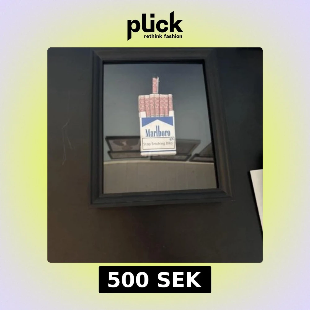 Säljer en snygg och lite annorlunda dekoration som föreställer ett Marlboro-paket fyllt med fejkade sedlar. Tavlan är inramad i en svart ram och går att antingen hänga på väggen eller ställa på ett skrivbord/hylla. Perfekt för dig som vill ha något unikt och samtalsväckande i rummet. Sedlarna är självklart fejk. Anledningen till försäljningen är att den inte längre passar in i mitt rum. Tavlan är i mycket fint skick och har inga skador. PRIS GÅR ATT DISKUTERA VID SNABB AFFÄR