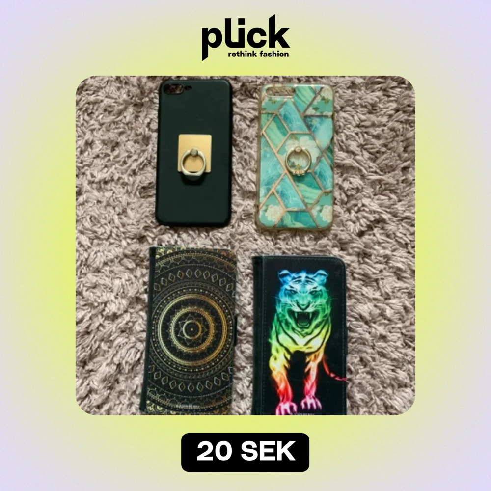 iPhone 7 plus. Två med plånboksfodral och två vanliga. Ena ringen sitter lite löst men funkar, den andra ringen saknar en diamant men är annars i bra skick. 1=5kr alla=20kr. Man får också buda om man vill.