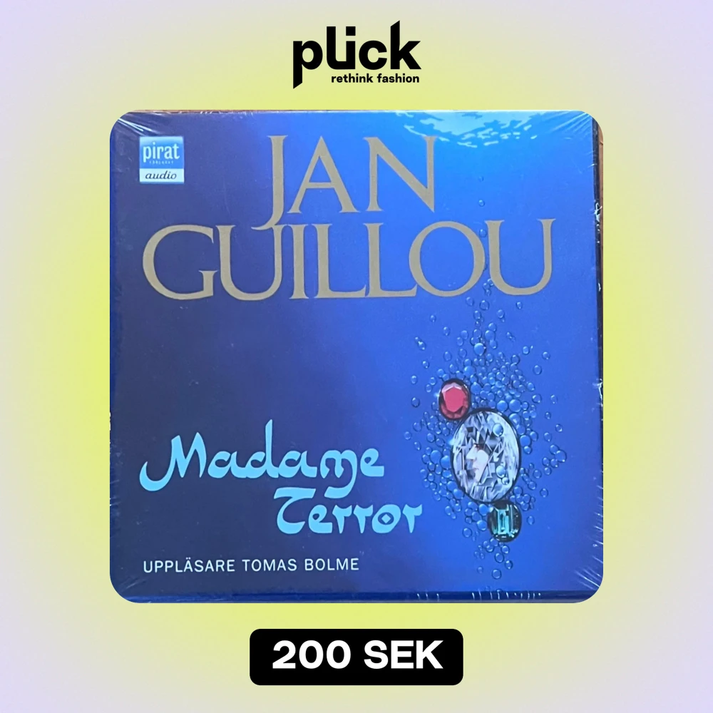 Ljudbok av Jan Guillou, uppläst av Tomas Bolme. 'Madame Terror' är en spännande berättelse om internationell politik och spionage. Omslaget är blått med gnistrande juveler och text i guld och ljusblått. Perfekt för dig som gillar thrillers och politiska intriger. Vi diskuterar pris