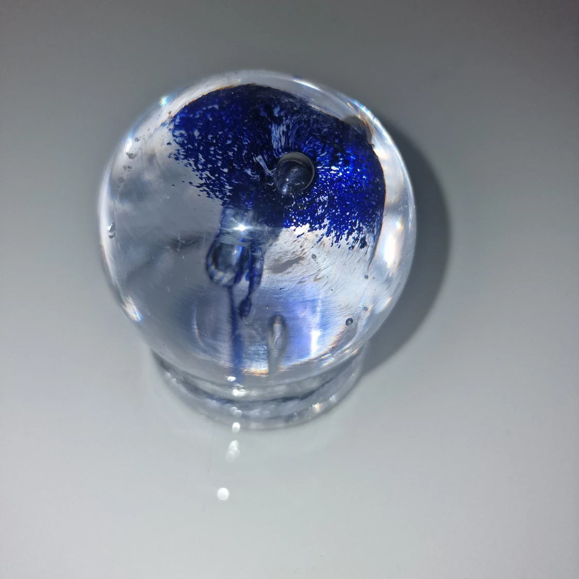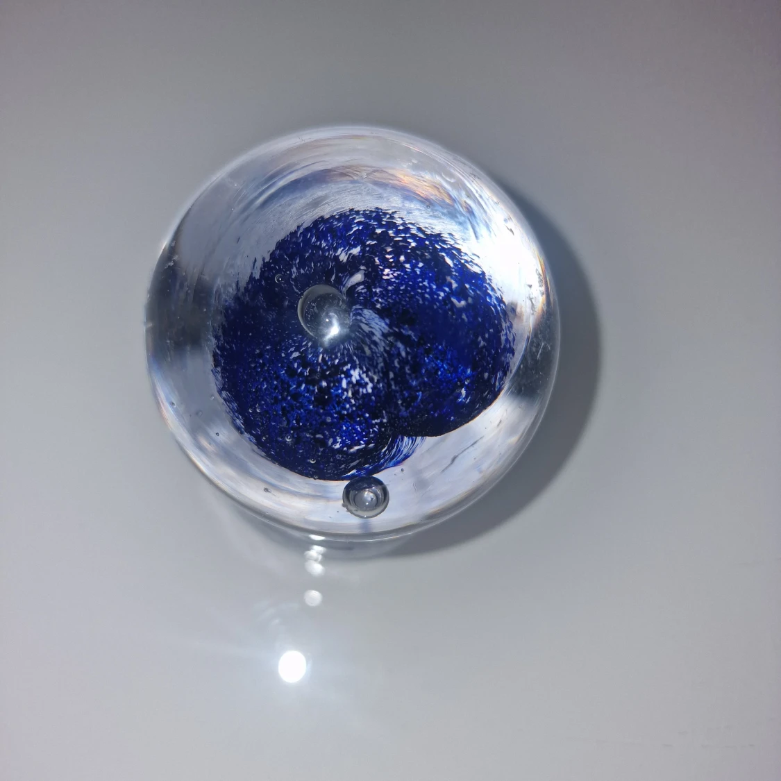 Fin glaskula med bubblor och blå manet som design.