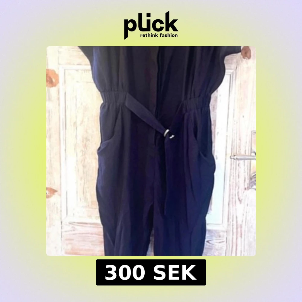 Snygg marinblå jumpsuit med knytband i midjan för en justerbar passform. Den har korta ärmar och praktiska fickor på sidorna. Perfekt för en stilren look.