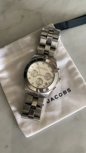 Äkta, Silvrig klocka från marc jacobs. Batterier behövs bytas, bara att lämna in den. Liten repa i glaset, i övrigt mycket fint skick.