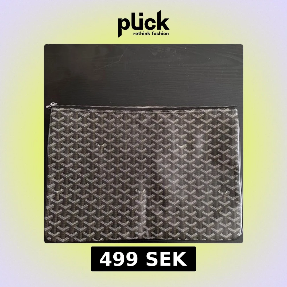 Svart datorfodral med ikoniskt grafiskt mönster i vitt och grått. Väskan har en smidig dragkedja upptill och insidan är ljusbeige. Perfekt för att bära dina essentials och ger en lyxig vibe till din outfit.