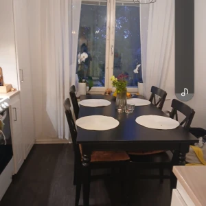 Snyggt matbord i mörkt .Bordet har en rektangulär form och stolarna har en klassisk design. Perfekt för köket eller matsalen. Stolar ingår ej . Pris kan diskuteras vid snabb affär