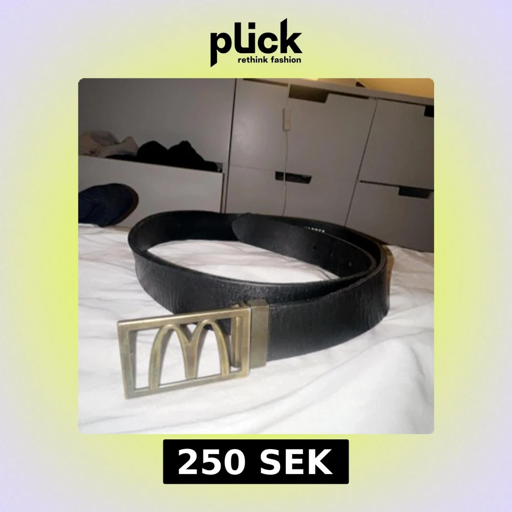 Snyggt svart bälte med ett unikt guldfärgat spänne som har en distinkt design. Perfekt för att ge en stilren touch till din outfit. Mcdonalds.