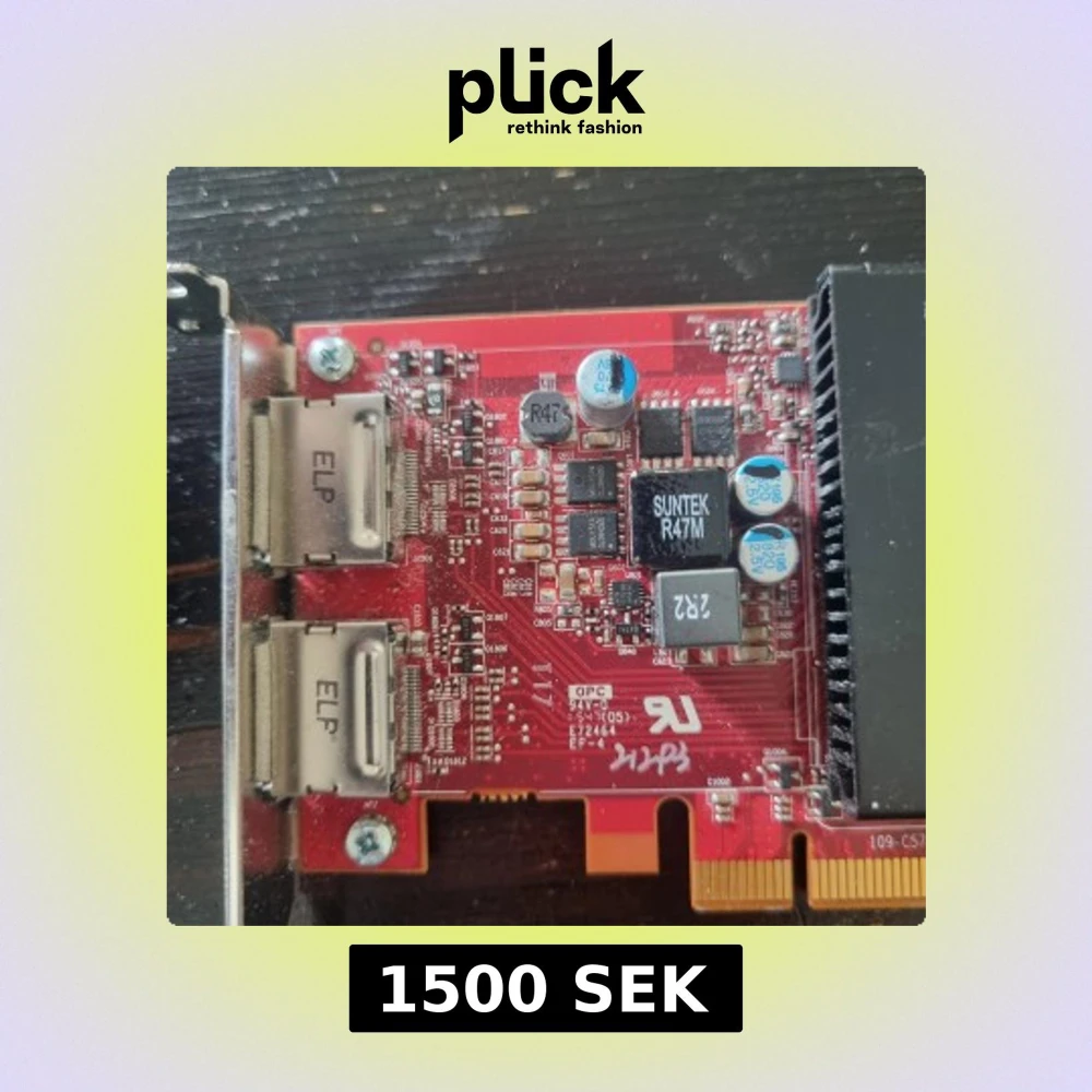 Säljer ett AMD FirePro W2100 grafikkort med röd kretskort, kylfläkt och två DisplayPort-utgångar. Perfekt för dig som behöver extra grafikkraft till datorn. Passar PCIe x16 och har tydlig AMD-logga på fläkten.