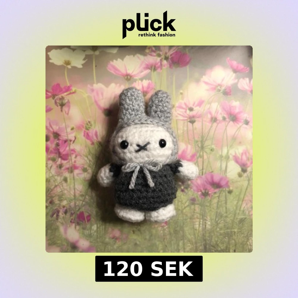 Virkad Miffy figur, gjord av 100% akrylgarn och är ca 10cm lång och 6cm bred Hatten är inte fast sydd och går att ta av
