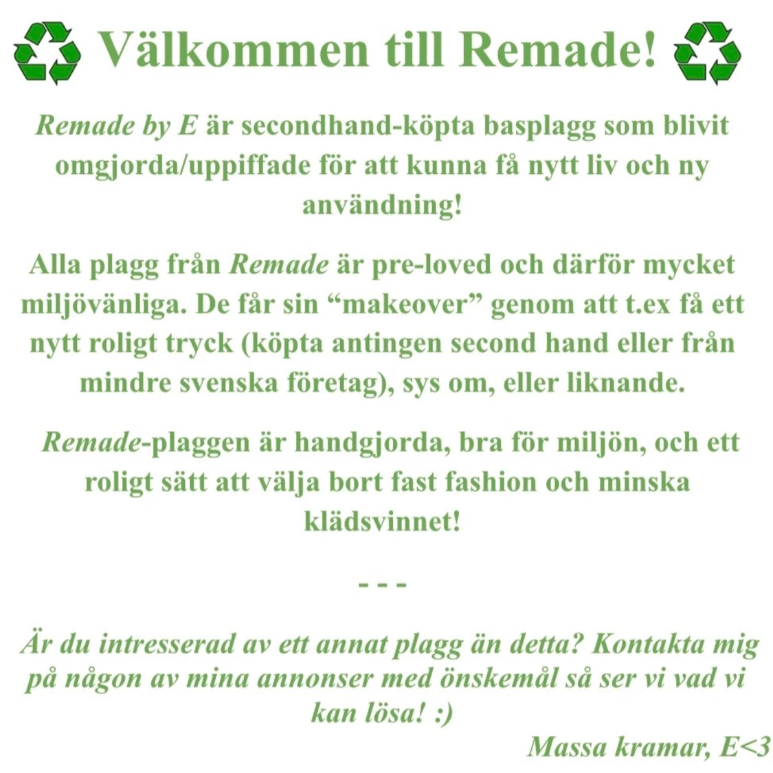 REMADE TOPS - INFO♻️ Läs gärna denna post om du är intresserad av att köpa/specialbeställa en remade top av mig! Detta är ett miljövänligt o kul projekt jag startat o jag hoppas ni gillar det! Hör av er om ni vill önska motiv, har frågor eller liknande🧚♀️💚