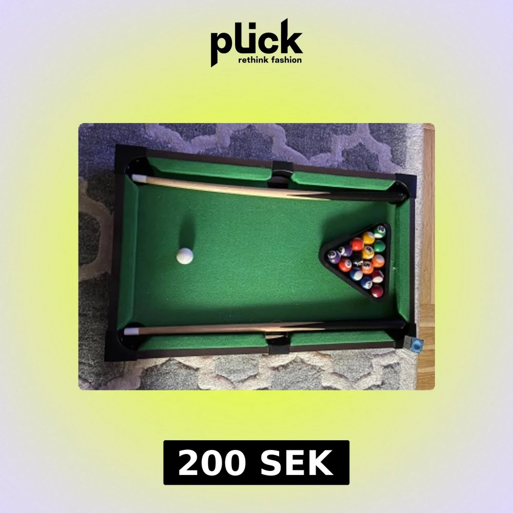 Säljer ett minibiljardbord med grön filt, två träköer, set med färgglada biljardbollar och en svart triangel för uppställning. Perfekt för att spela hemma med kompisar. Bordet har svarta kanter och är kompakt i storleken, lätt att flytta runt.