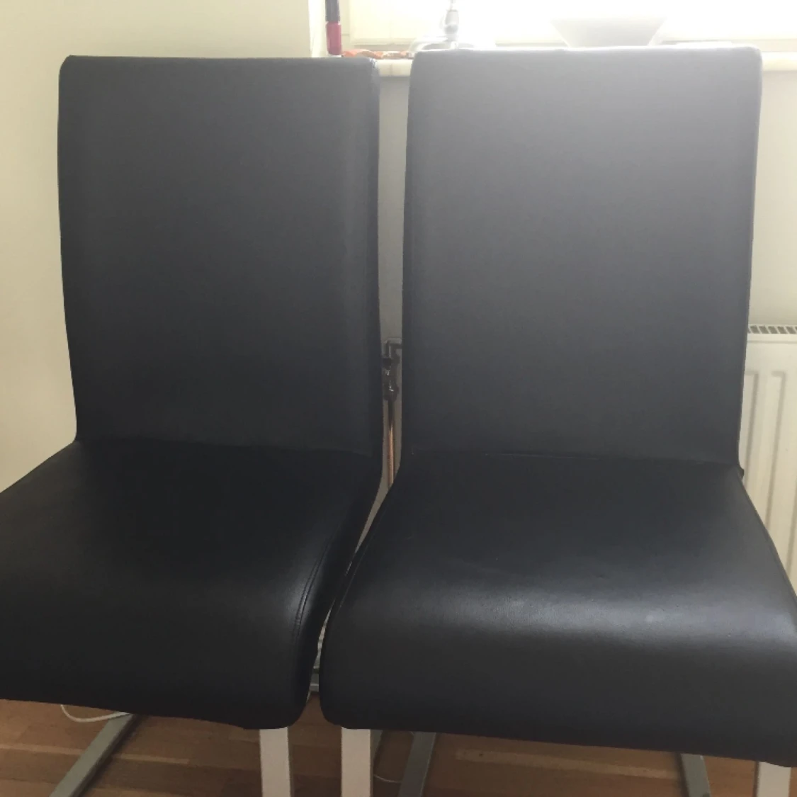 Två konstläder stolar med aluminium underrede. Perfekt som matbordsstolar. Dom har lite gung i. 100 kr styck.